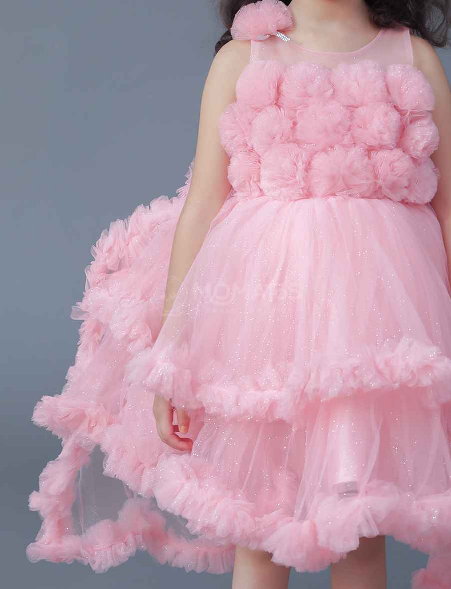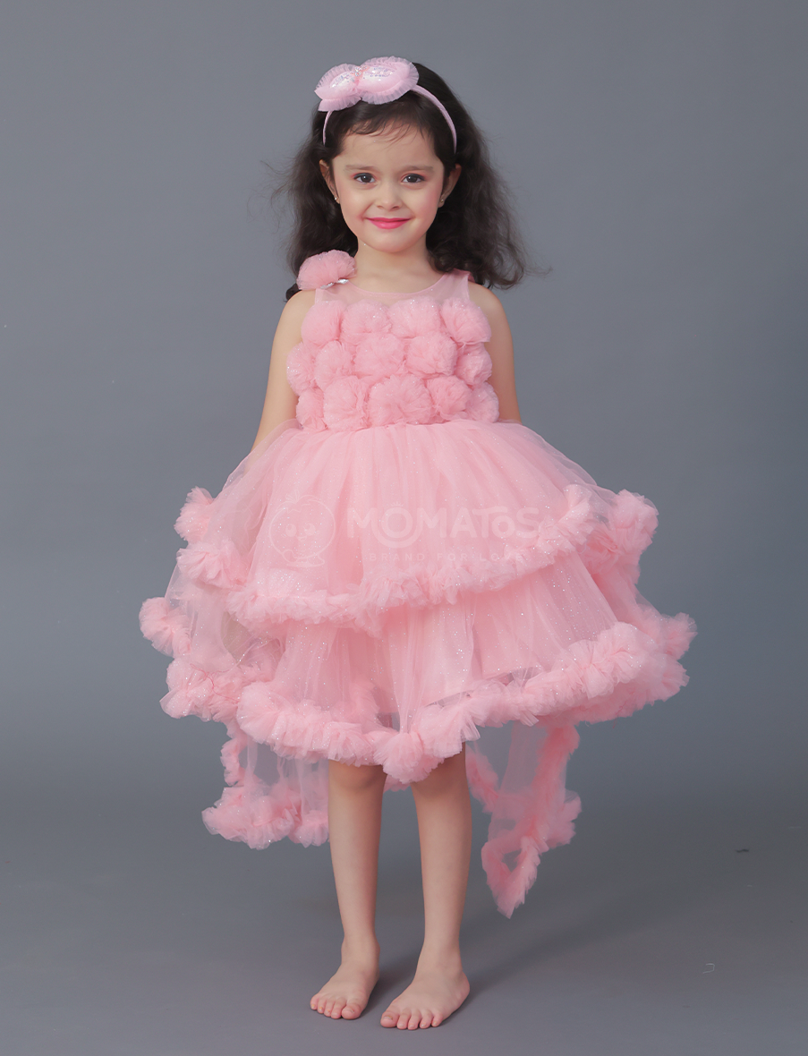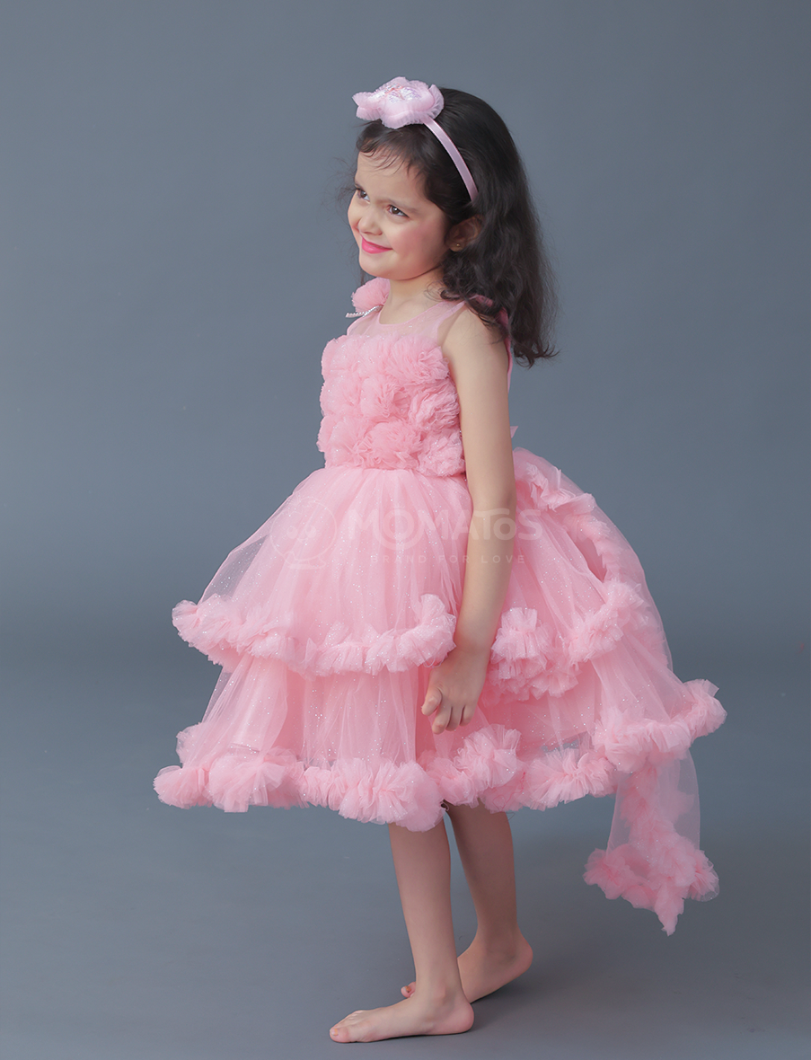 A peach frock for a girl exudes delicate charm and elegance. The soft peach hue and flowing silhouette, adorned with subtle details like lace or floral embellishments, create a graceful and enchanting appearance, perfect for special occasions.