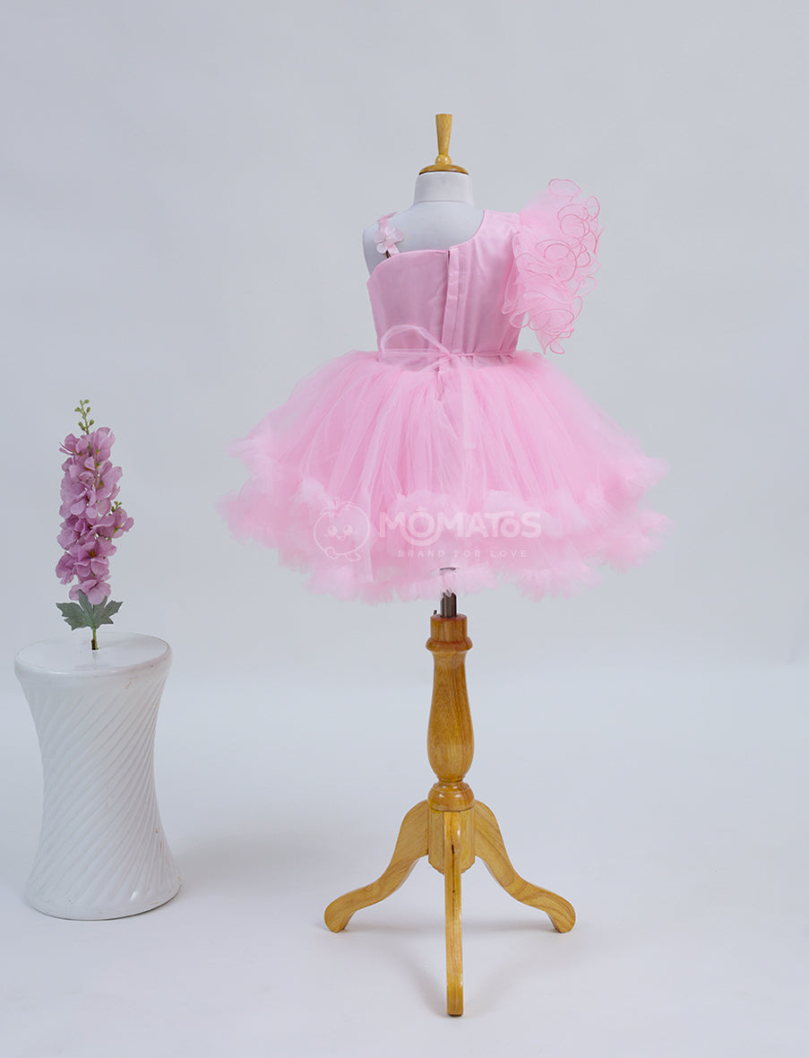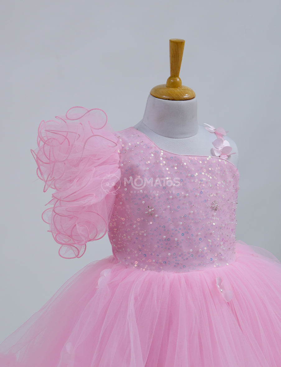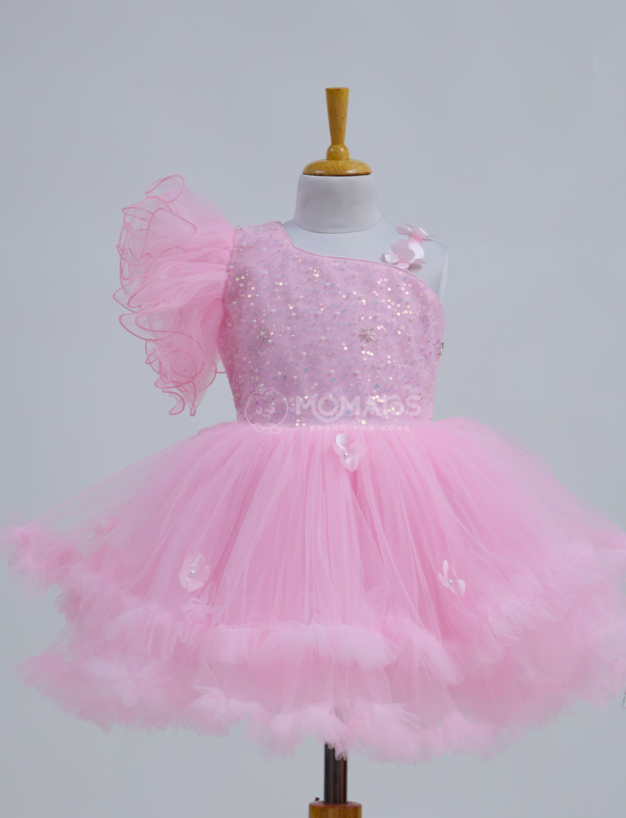 Let your little one shine in this one-shoulder pink party dress, featuring sparkling sequins, layered tulle, and delicate floral pattern. Perfect for weddings, birthdays, and special events!