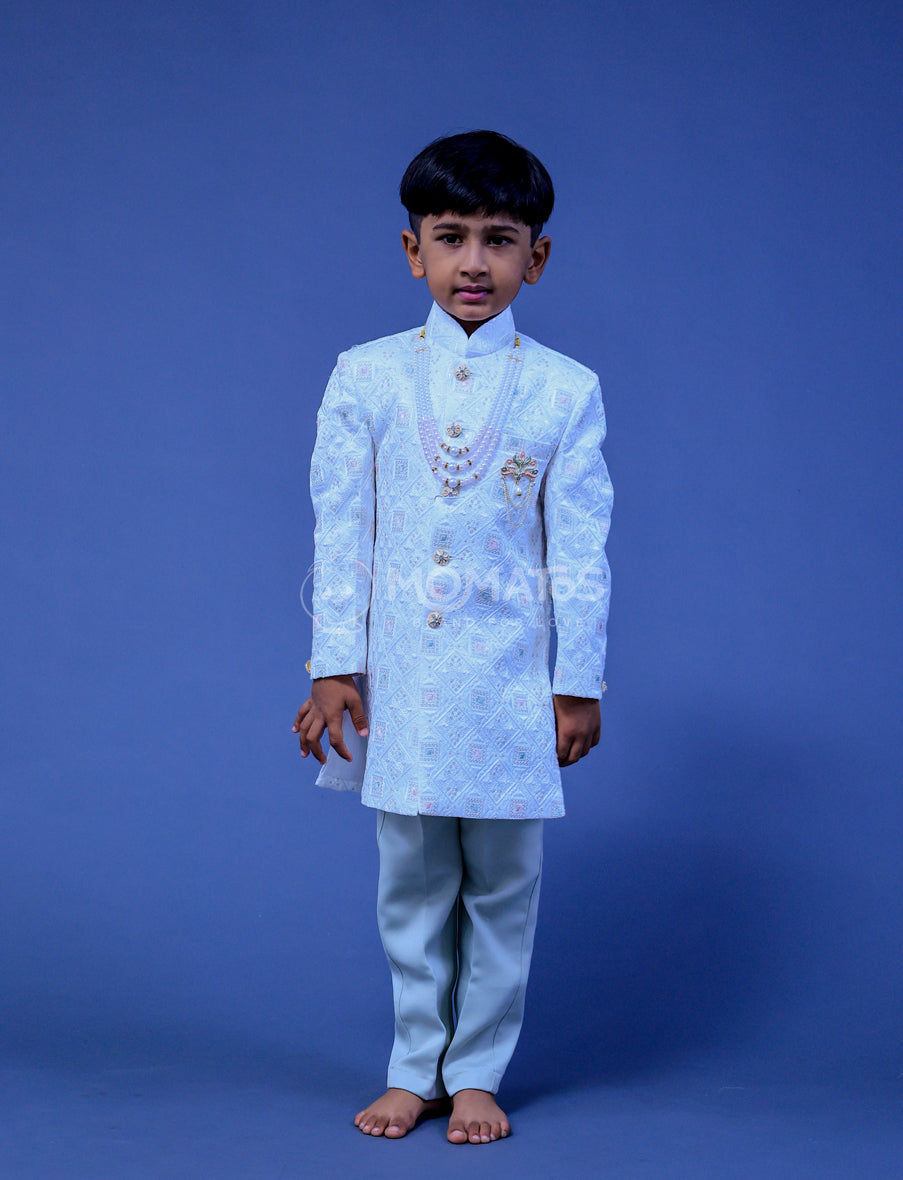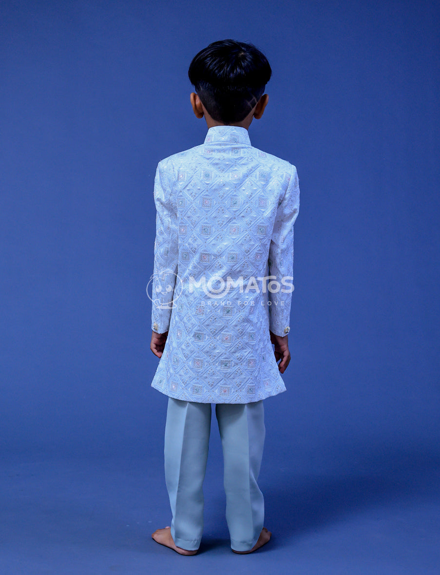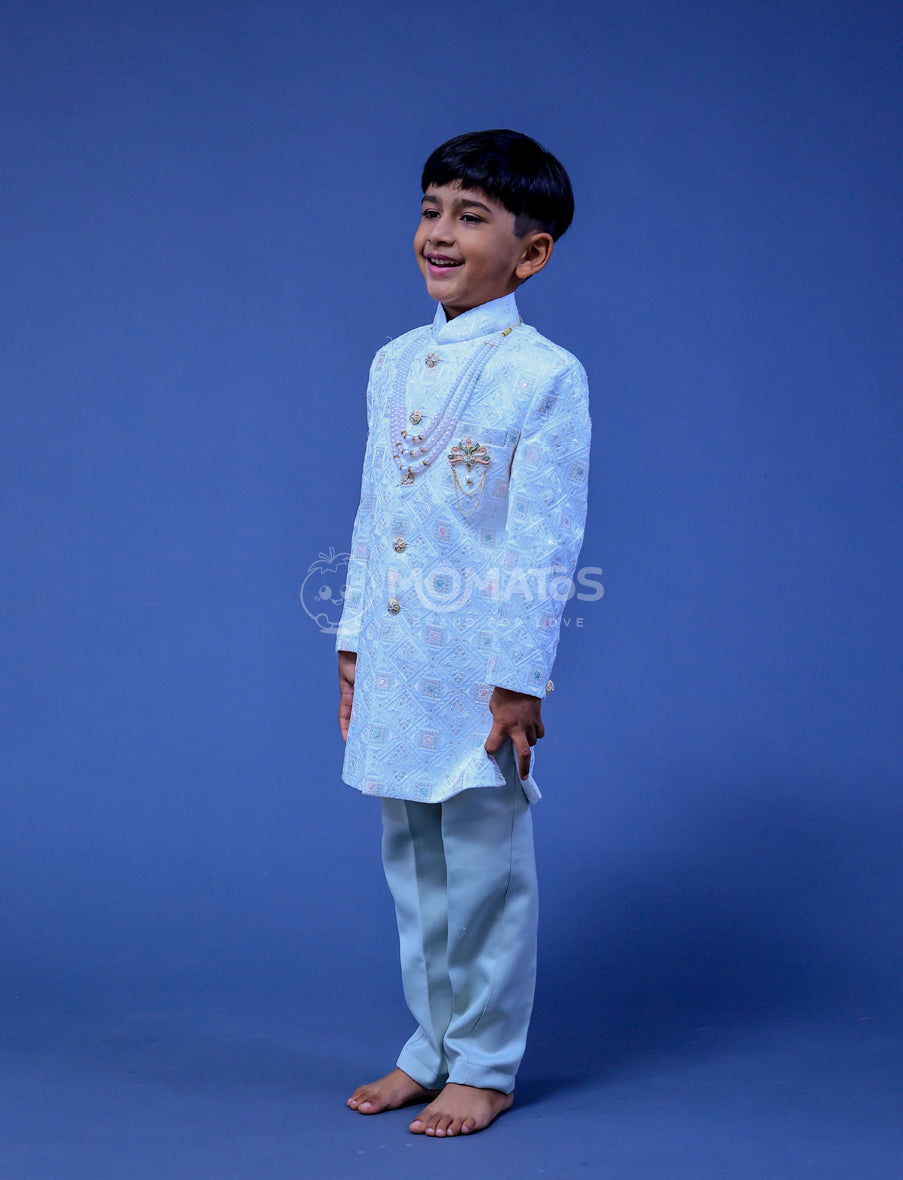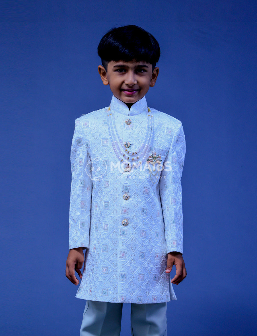 Elegance meets tradition in this stunning white sherwani for boys. With its intricate detailing and classic cut, this sherwani offers a timeless look that's perfect for any special celebration. Crafted for comfort and style, it's the ideal choice for your little prince